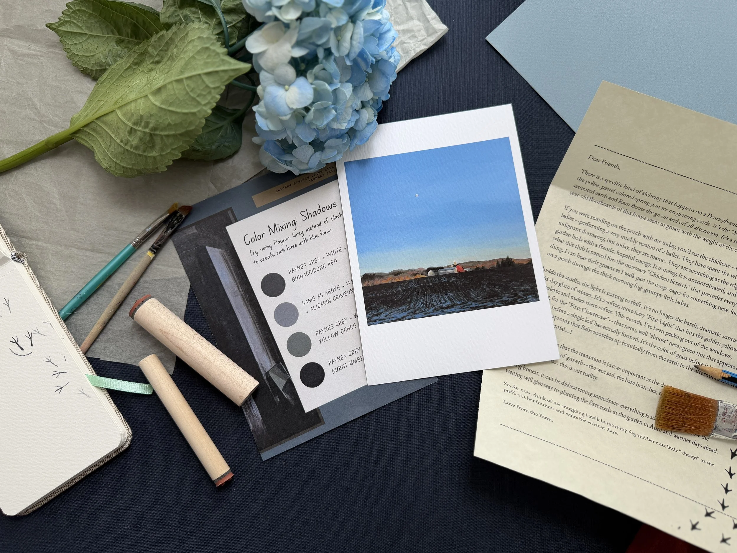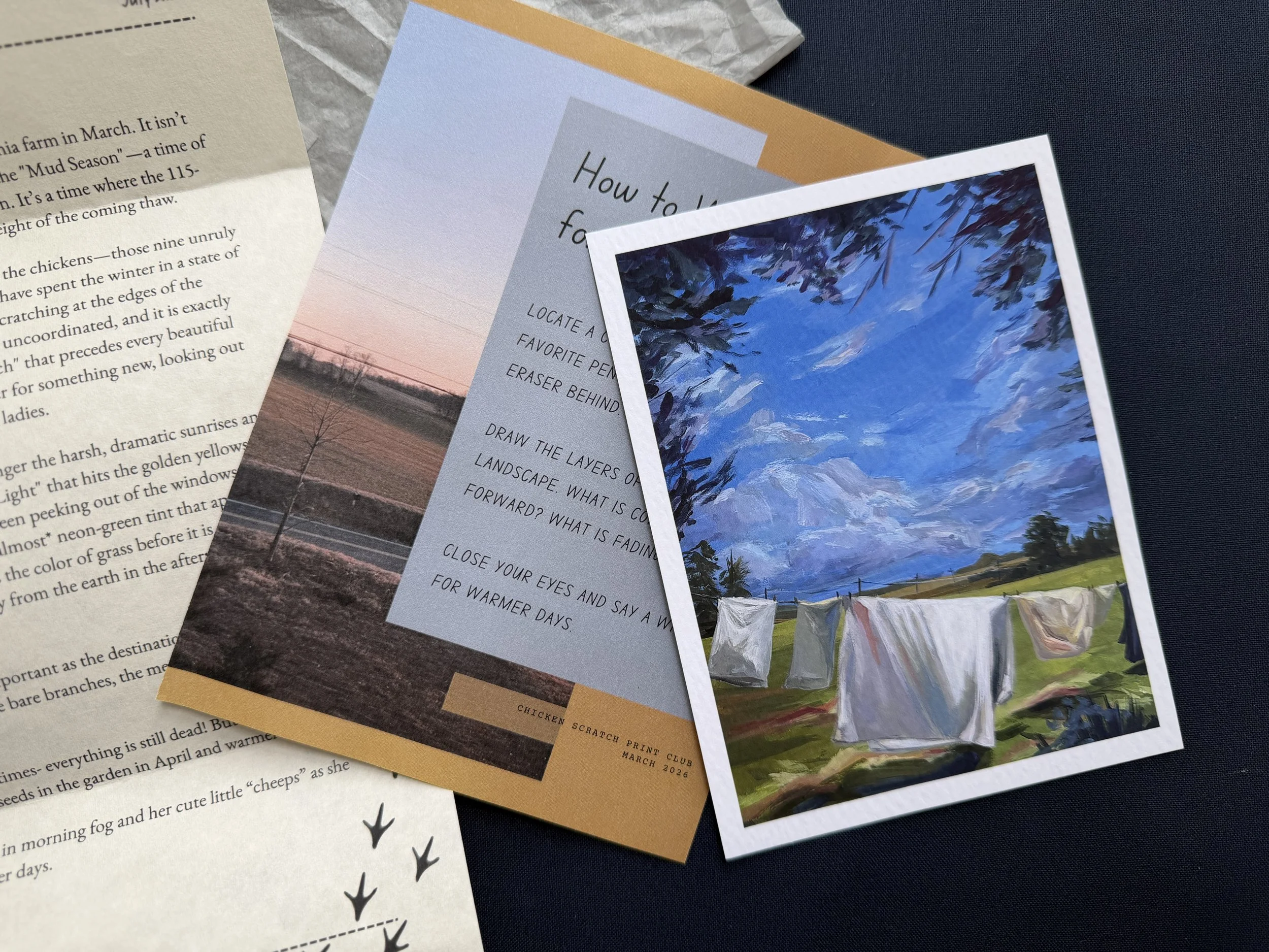 "After 15 years in the classroom, I’ve learned that the best art starts with a mess. I call it 'Chicken Scratch.' This monthly print club is a return to the tangible—Giclee prints, handwritten stories, and the slow rhythm of the farm."